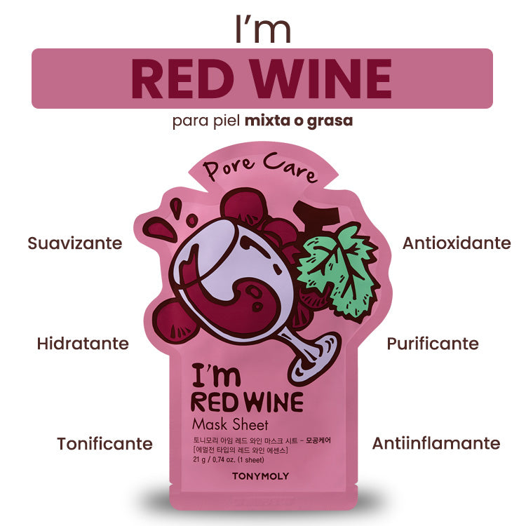 Mascarilla de vino tinto adecuada para pieles con tendencia grasa o incluso con problemas de acné o poros dilatados. Esto se debe a que esta mascarilla contenga una composición con Extractos de Vino Tinto, siendo este su ingrediente clave. De esta forma, esta mascarilla rica en propiedades antioxidantes y antiinflamatorias ayuda a depurar la piel. A su vez, reduzca la apariencia de poros dilatados mientras tensa la piel. Además, se reduce el acné y los brotes futuros.